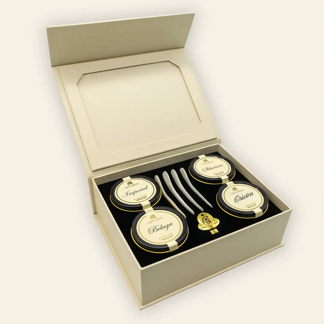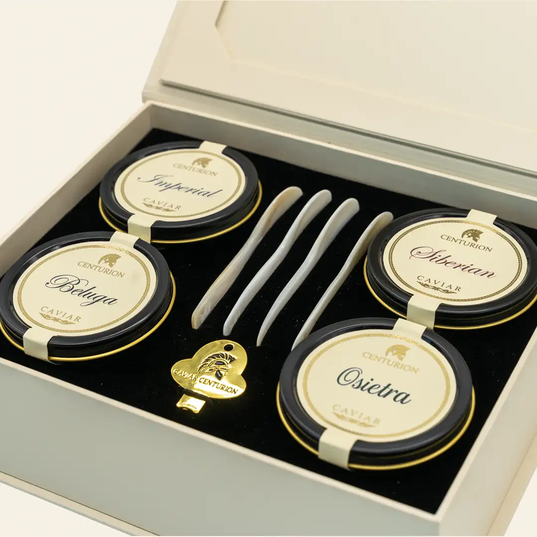 A Caviar Centurion válogatása biztosítja, hogy minden dobozban a lehető legjobb tokhal ikra legyen. A kaviárjaink komplex, mestermunkát tükröző ízeket kínálnak. Bármilyen alkalomra is vásárol, ez a díszdoboz a legkiválóbb fajtákat foglalja össze egy elegánsan összeállított csomagban.