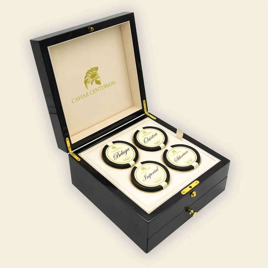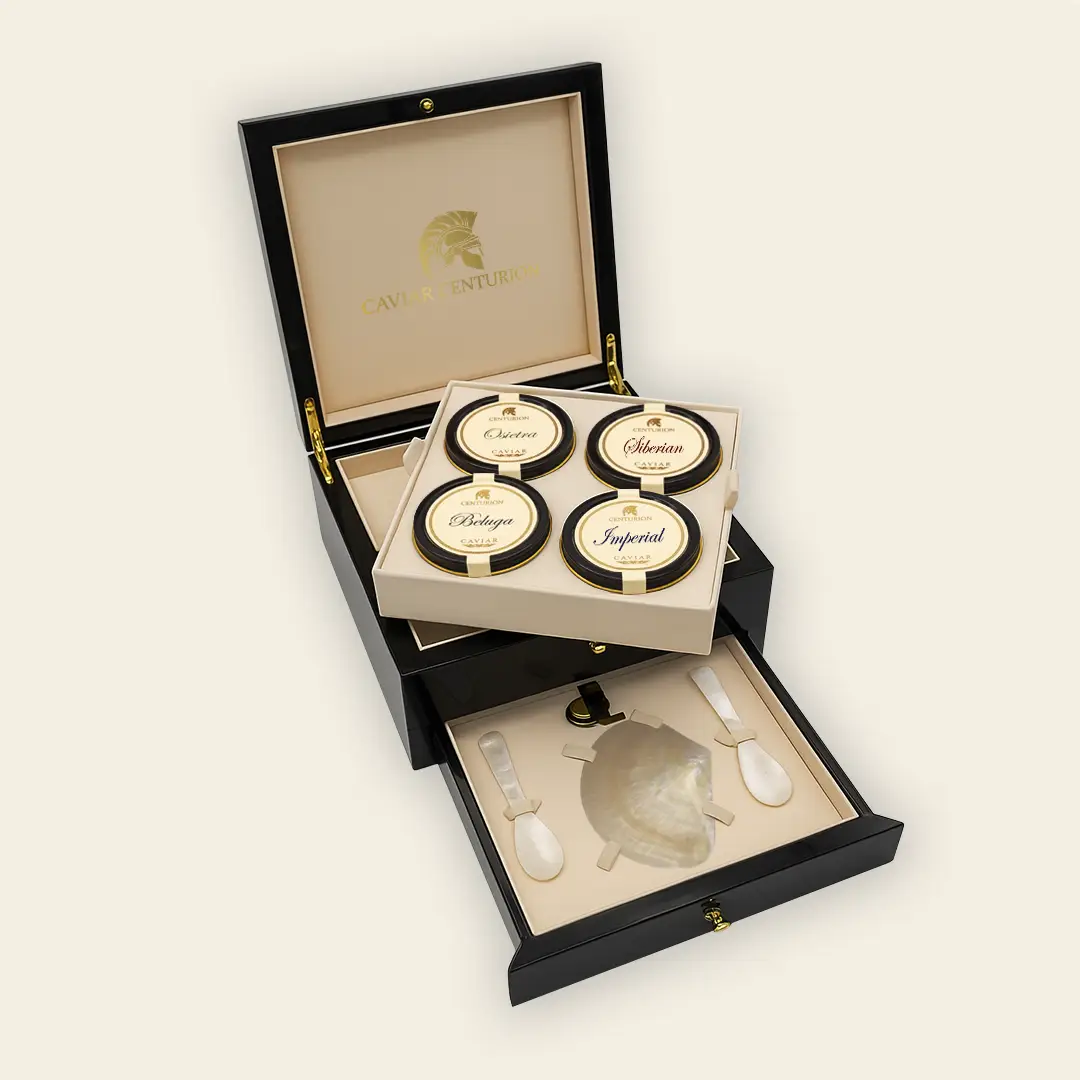 A Caviar Centurion válogatása biztosítja, hogy minden dobozban a lehető legjobb tokhal ikra legyen. A kaviárjaink komplex, mestermunkát tükröző ízeket kínálnak. Bármilyen alkalomra is vásárol, ez a díszdoboz a legkiválóbb fajtákat foglalja össze egy elegánsan összeállított csomagban.